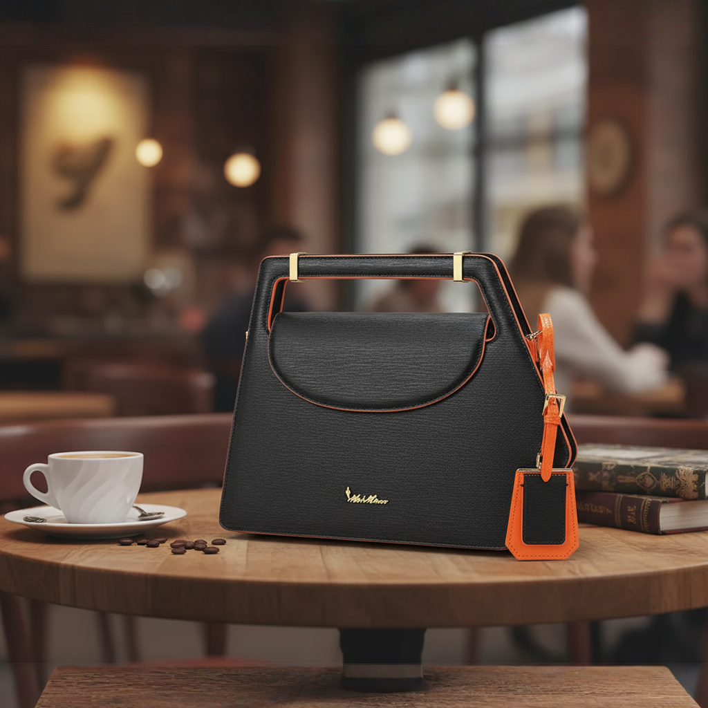 A Style Statement of Lush Personality To Claim: 'I Am Centered. Secured In My World!' A True Treasure To Determine Your Enriched Persona Being The Center Of Attraction For All. Just Not A Hand Bag But A Resourceful Assert For All Your Essentials. It's A Black Leather Purse With Orange Base, Two Zipped Pockets & Three Void Passages, Attached With A Leather Belt. What More You Dream Of!