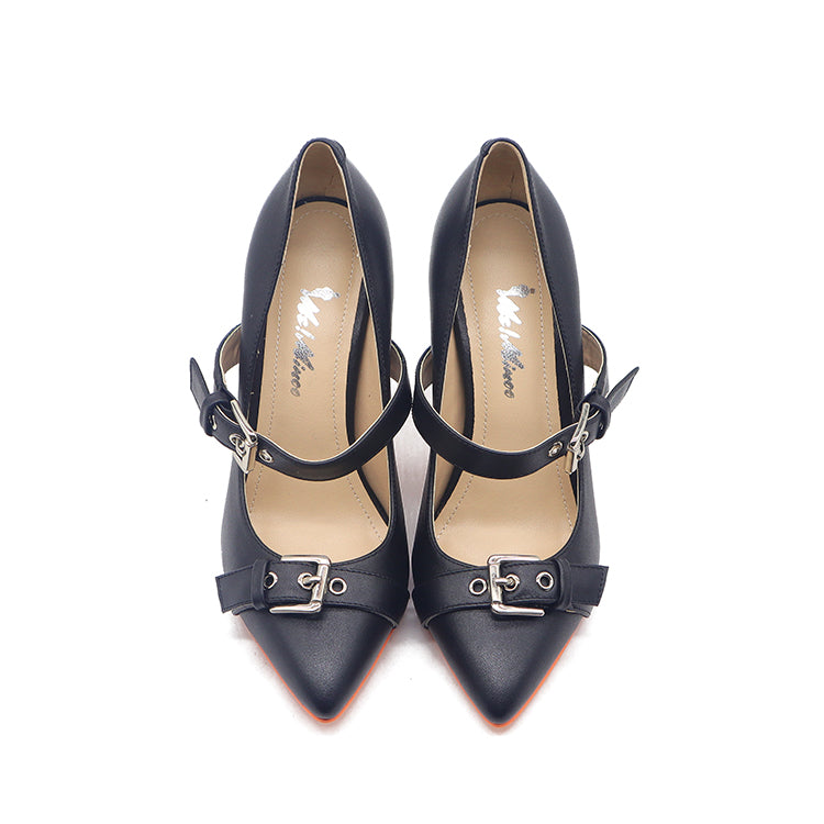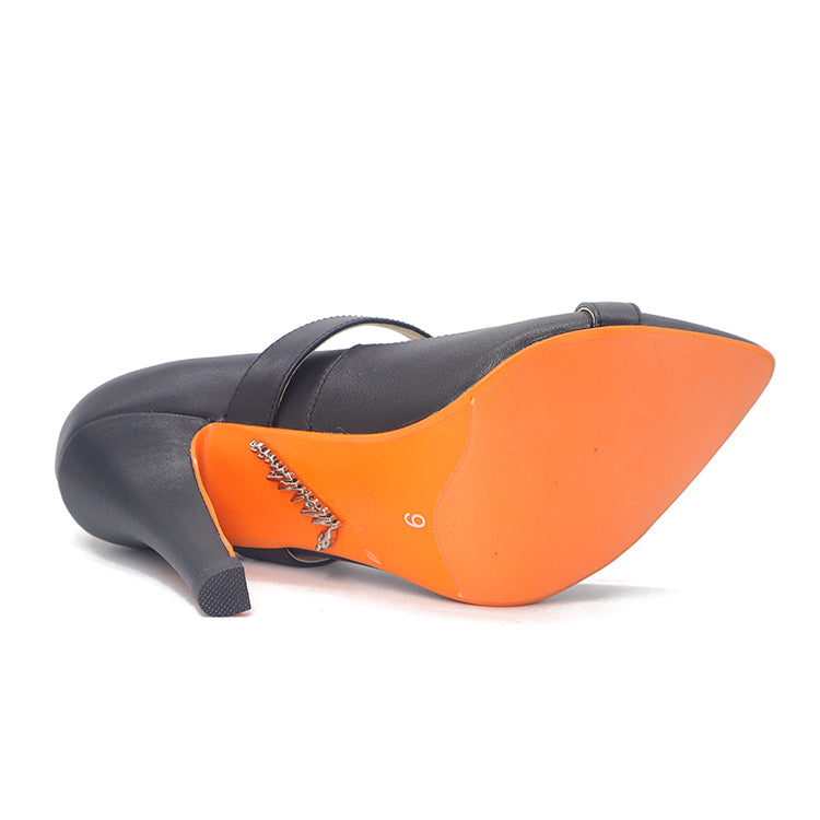 A Remarkable Gentility Just To Say: ‘I Am Classy!’ A Style Motion To Change The Notion, Of Being Fashionable. It’s All You Need To Be Trendy And Comfortable. It’s A Customized, High Quality Black Leather Heel, Featuring A Closed Toe Front, Pointed Toe-Shape, Back Strap With Side Buckle & An Orange Sole, For A Perfect Fit.