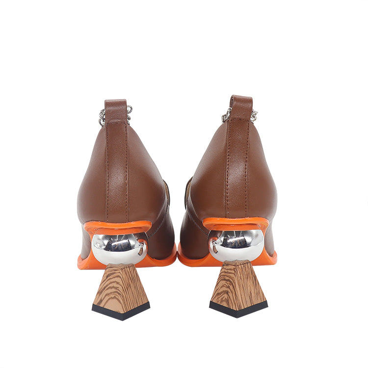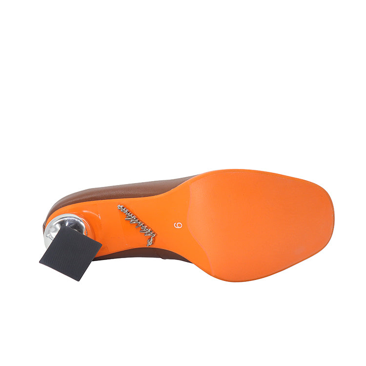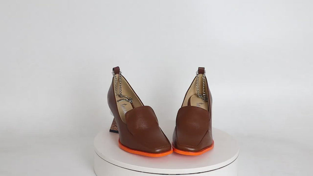 A Trademark Of Tastefulness To Tag Yourself: ‘I Am Complicated!’ A Strong Statement Of Your Sophistication And Attitude. It’s A High Quality Brown Leather Shoe, Featuring A Square Toe And A Metallic Chain At Ankle, Cushioned Inner Sole, It Has A Round Bottom And A Mid Block Wooden Heel, An Orange Base Sole, For A Comfortable Fit.