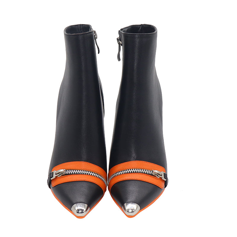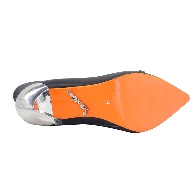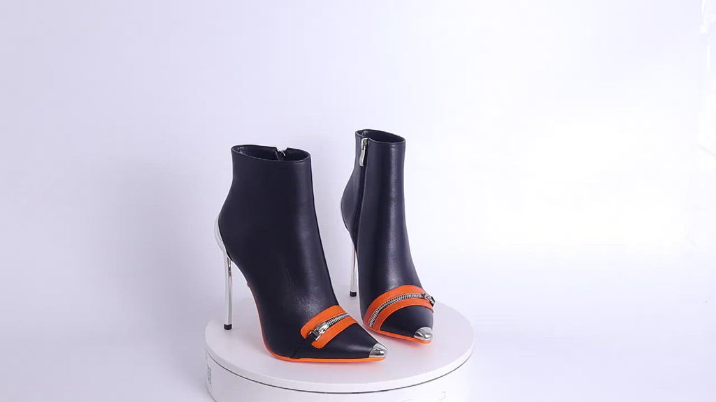‘I Am Sexy!’ It’s Certainly Ravishing, High On Demand, Custom Heels. It’s A High Quality Black Leather Heel, Featuring A Closed Toe Front, Metallic Tip, Orange Strip With A Zip On Front, Pointed Toe, A Half Size Zipper Positioned On Interior Side For A Perfect Fit. It Is Branded In Sole With Inner Cushioning For Comfort.